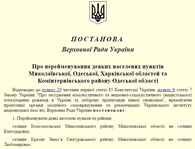 В соответствии с документом, поселок Комсомольское Николаевского района Николаевской области переименован в поселок Благодаровка. Поселок Красное Знамя Снигиревского района переименовали в Любомировку.