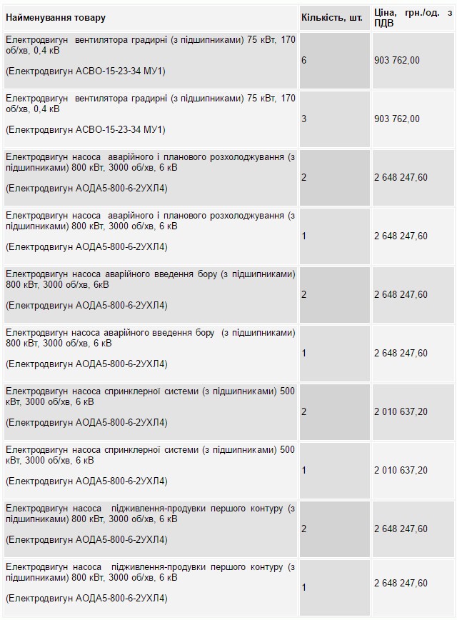 Двигатели АСВО-15-23-34 МУ1 вентилятора градирни с подшипниками приобрели по 904 тысяч гривен за штуку. В июне 2012 года атомщики покупали их на 40% дешевле - по 547 тысяч гривен за штуку.