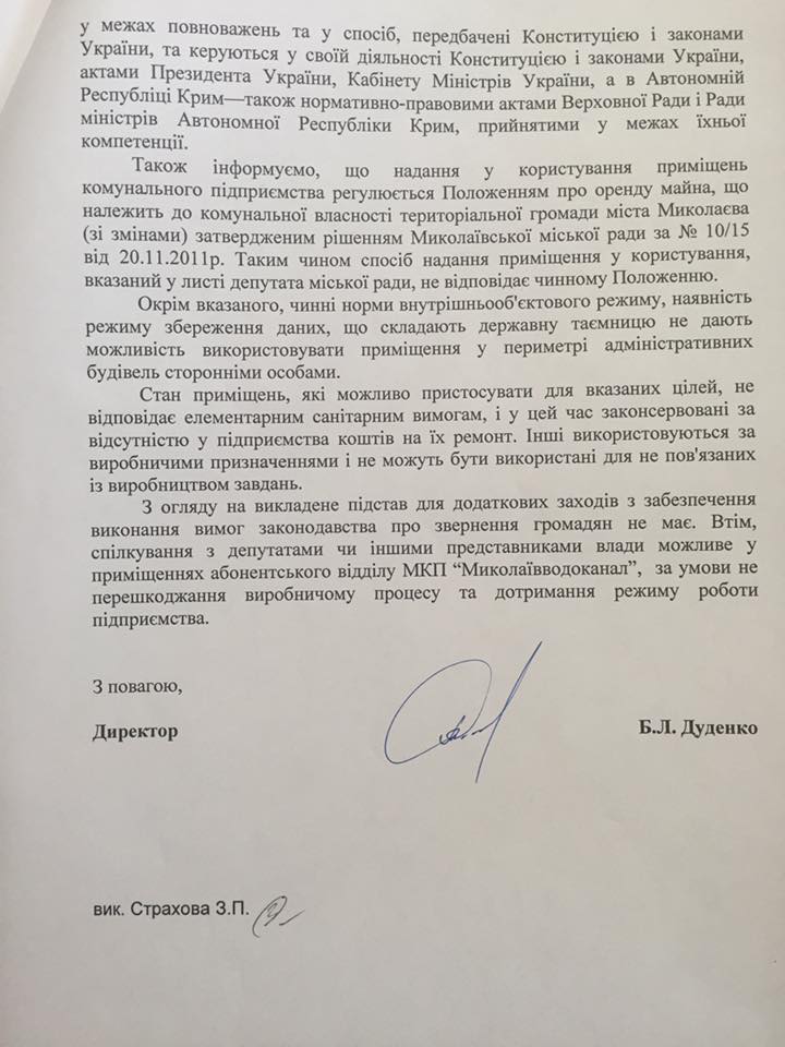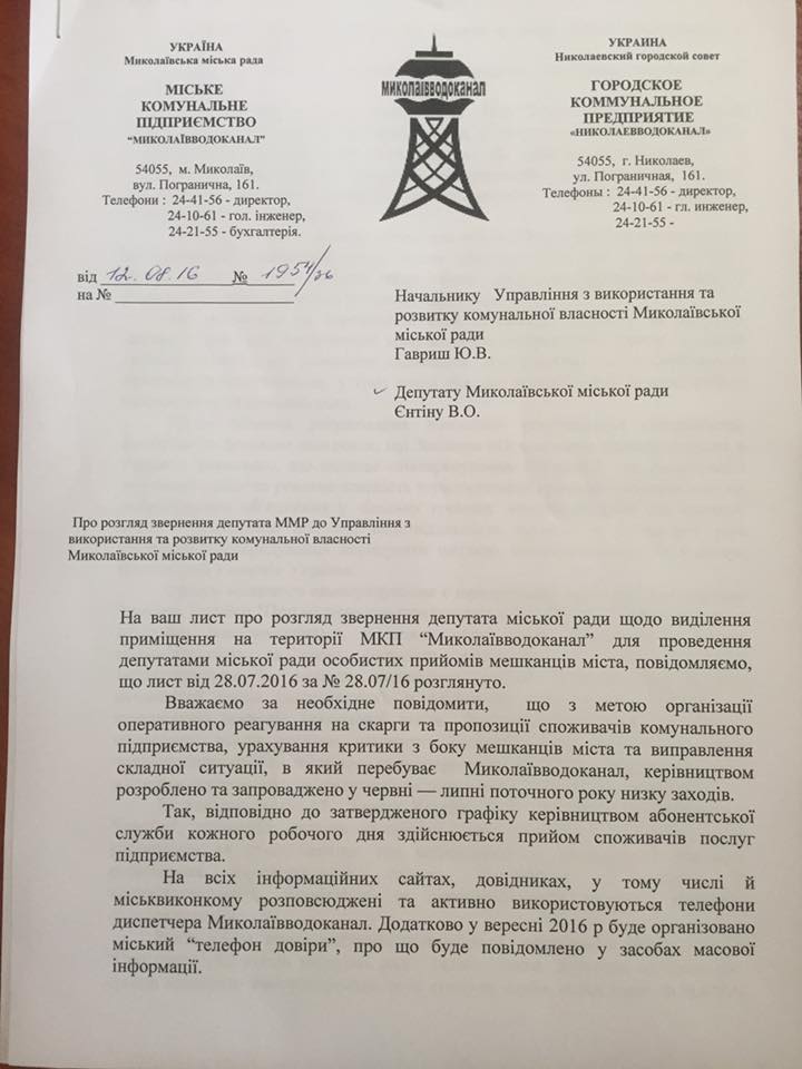 «Николаевводоканал» отказал Ентину в предоставлении помещения для приемной