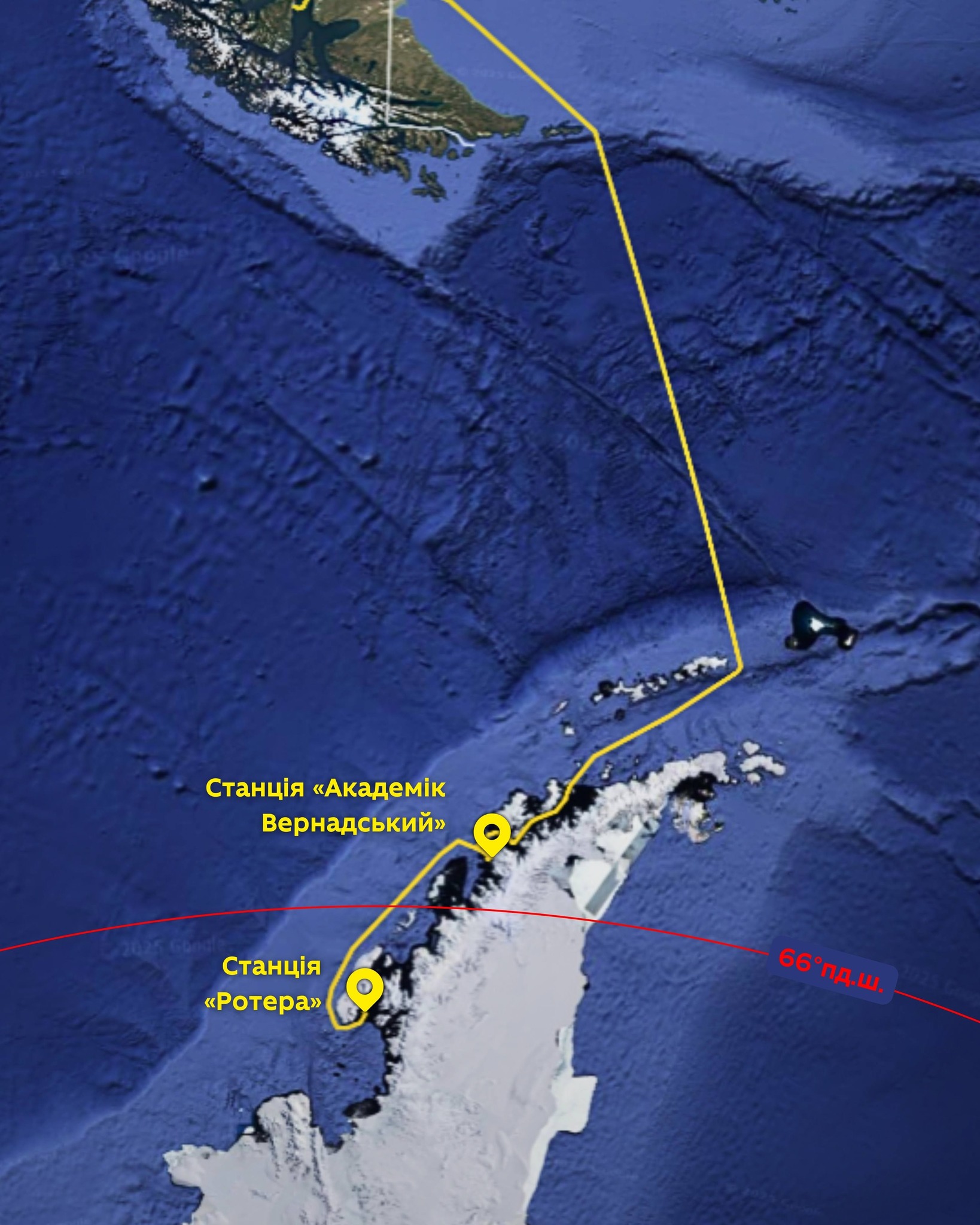 Украинский ледокол «Ноосфера» впервые начал работу за Южным полярным кругом. Фото: Национальный антарктический научный центрМаршрут «Ноосферы» пролег от украинской антарктической станции «Академик Вернадский», расположенной перед полярным кругом, далее на юг — через Южный полярный круг, залив Маргарет-Бей на западном побережье Антарктического полуострова до британской антарктической станции «Ротера» на острове Аделеид.
