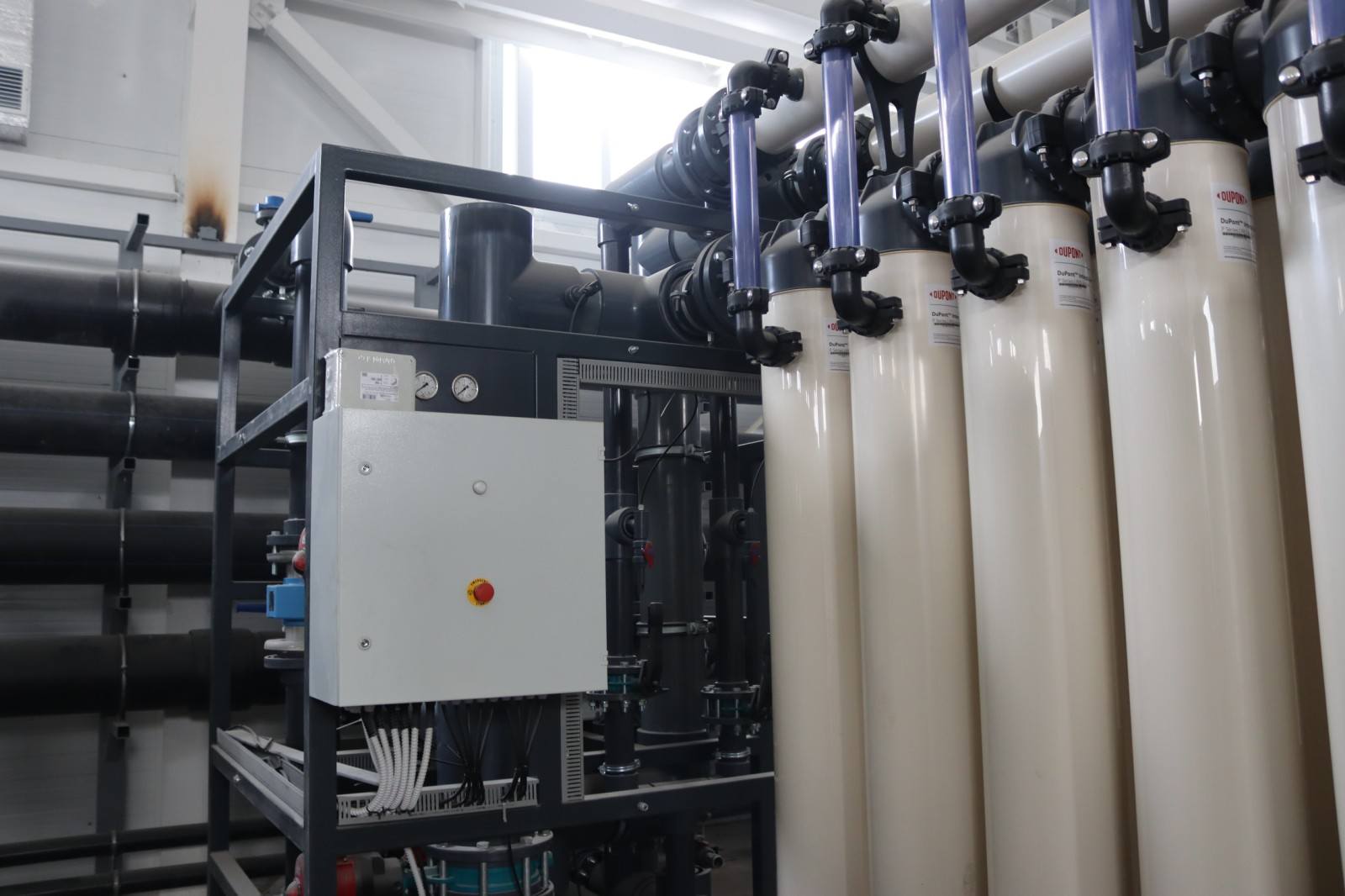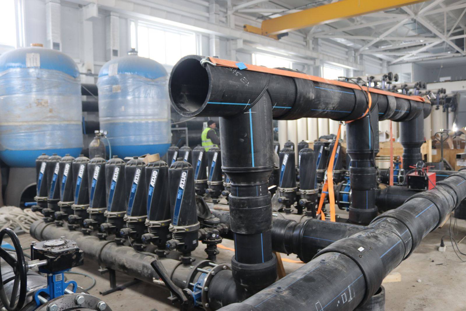 В производственных помещениях смонтирована значительная часть технологического оборудования: фильтрационные колонны, трубопроводы, запорная арматура, узлы подачи и очистки воды. Параллельно специалисты выполняют сварочные работы, подключают насосное оборудование и готовят системы к наладке.