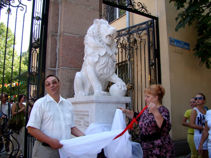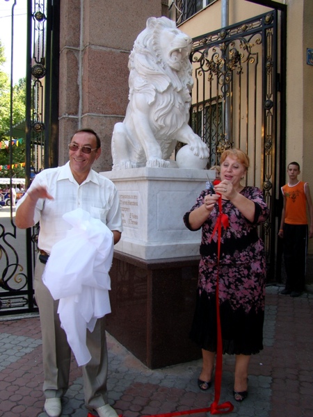 При входе посетителей ждали два мраморных льва. Их открыли вместе директор зоопарка Владимир Топчий и заместитель мэра Раиса Вдовиченко.