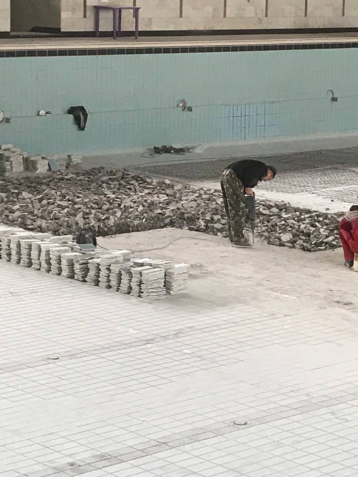 Главный инженер ООО «Металлург Юга» отметил, что рабочие впервые взялись за капитальное обновление дна чаши большой спортивной ванны. Они меняют стяжку, плитку, усиливают герметизацию форсунок дна.