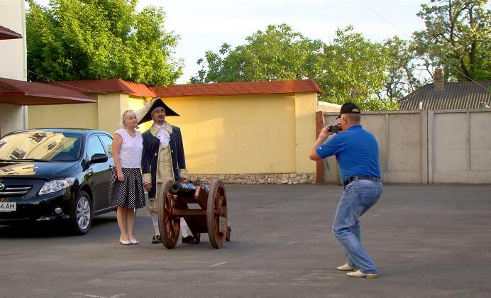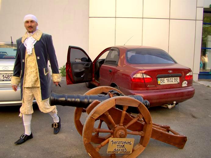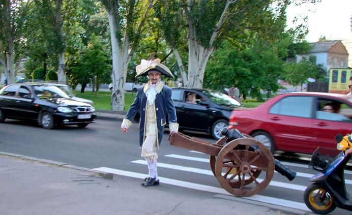 Возможно, вам уже приходилось видеть на улицах Николаева мужчину в маскарадном костюме, в шляпе с перьями, с закрученными усами и раздвоенной бородкой, да еще и катящим за собой на деревянной тележке пушку.