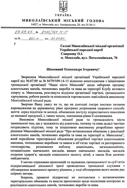 В ответ на обращение Николаевской городской организации Украинской Народной Партии относительно несогласия с инициативой о запрете продажи пива, алкогольных напитков и табачных изделий на территории Яхт-клуба, в своем письме городской голова Владимир ЧАЙКА поблагодарил главу городской организации УНП Александра СМИРНОВА «за заботу о николаевских предпринимателях, которые создают рабочие места и платят налоги, содействуют повышению уровня потребления продукции украинского и николаевского производства, обеспечения николаевцев работой». Об этом сообщает пресс-служба Николаевской областной организации Украинской народной партии.