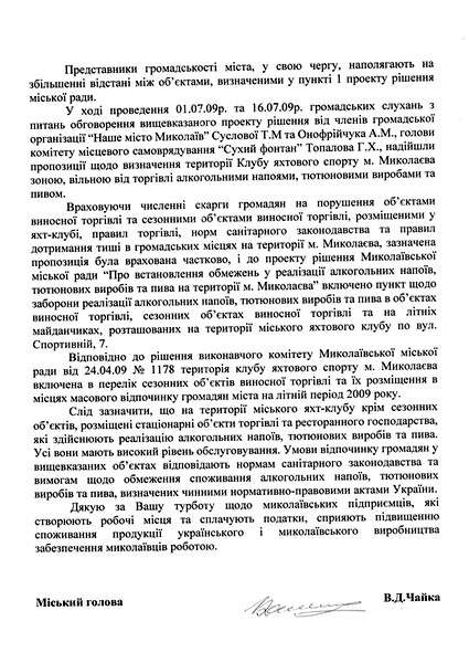 В тоже время, по словам городского головы, «учитывая многочисленные жалобы граждан» и по настоянию участников общественных слушаний в проект решения горсовета «Об установлении ограничений по реализации алкогольных напитков, табачных изделий и пива на территории г.Николаева» был включен пункт относительно «запрета реализации алкогольных напитков, табачных изделий и пива в объектах выносной торговли, сезонных объектах выносной торговли и на летних площадках, расположенных на территории городского яхтенного клуба».