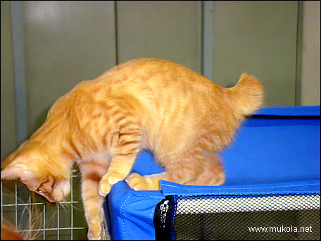 Очень красивы британские шиншиллы, внимательно и оценивающе смотрят на посетителей шотландские вислоухие, а кто-то и вовсе не обращает внимание на двуногих. К примеру, мама-ориенталка, ничтоже сумняшеся, кормила своих отпрысков, а маленькая рысь – курильский бобтейл, с маленьким хвостиком, – лихо гонялась за перышками по крышке клетки.