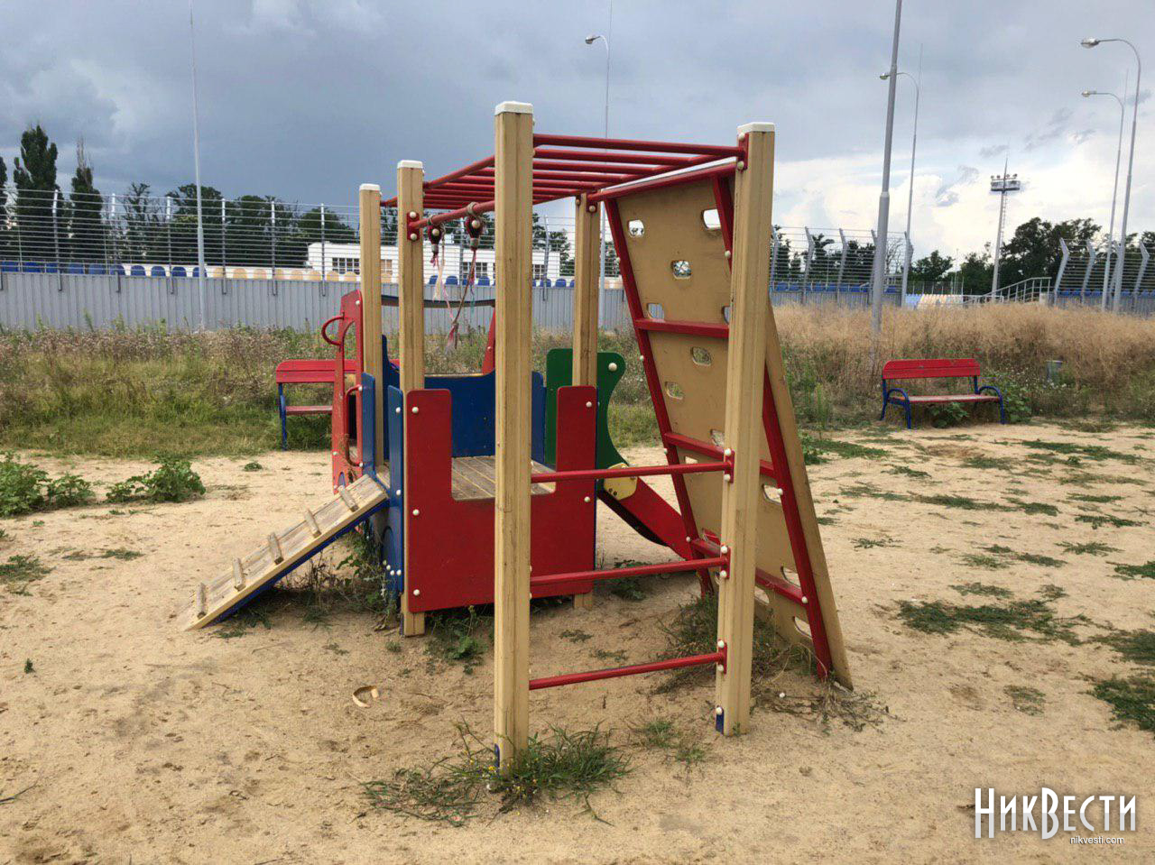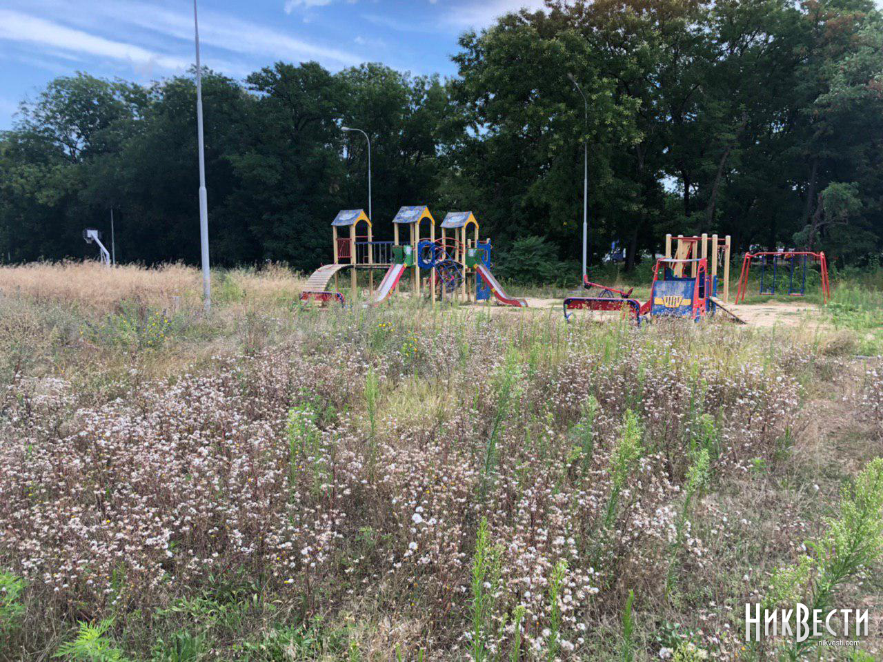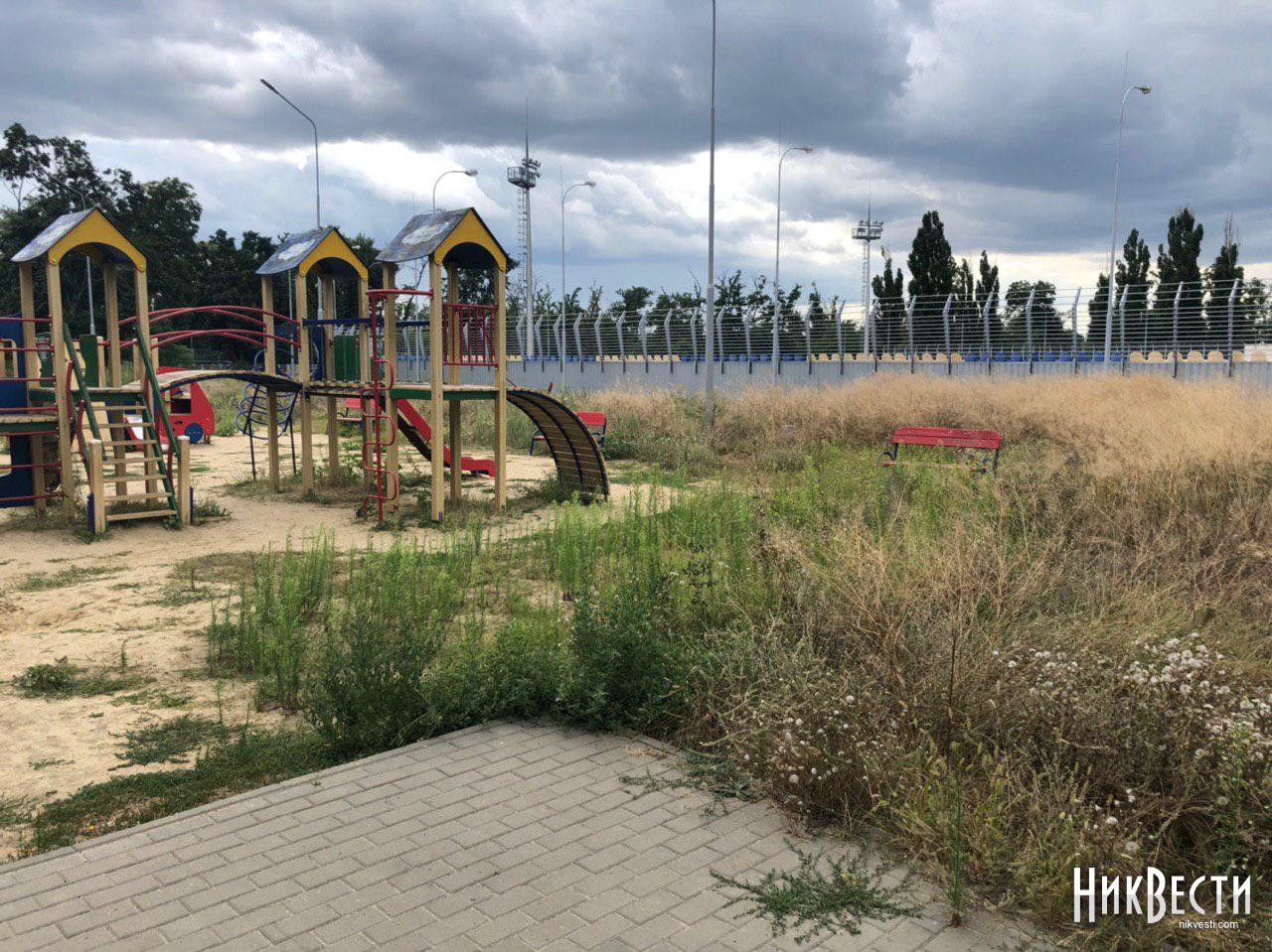 Жительница Николаева жалуется, что новая детская площадка, которая находится возле ограждения стадиона, заросла травой и бурьяном.