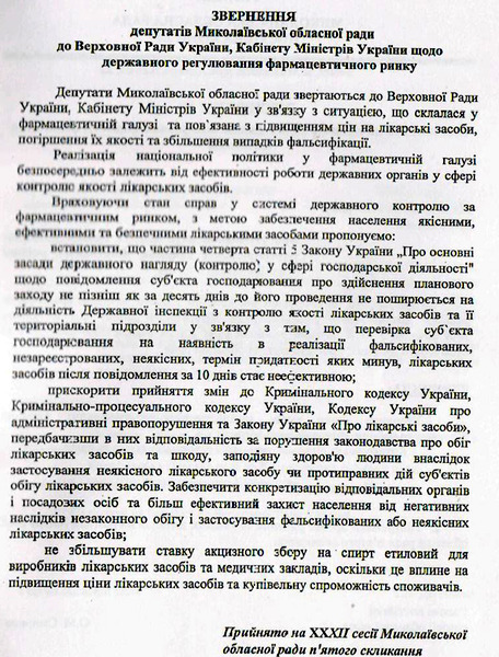 Как пояснили в ходе обсуждения данного вопроса депутаты Николаевского областного совета это обращение вызвано спекуляцией вокруг цен на лекарственные средства, ухудшением их качества и увеличением случаев фальсификации.