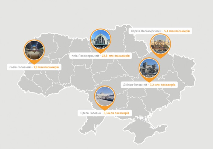 На втором месте оказался вокзал «Львов-Главный» - 7,8 миллиона пассажиров, на третьем - «Харьков-Пассажирский» с количеством в 5,4 миллиона пассажиров. Далее идет «Одесса-Главная» - 5,3 миллиона и «Днепр-Главный» - 3,2 миллиона пассажиров.