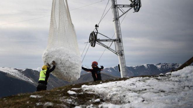 Около 50 тонн снега были доставлены вертолетами в окрестности горнолыжного курорта Люшон-Сюпербаньер во французских Пиренеях и разбросаны по обнажившимся от необычайно теплой зимы склонам.