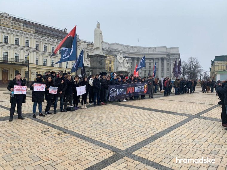 Параллельно с Маршем женщин на Михайловскую площадь вышли несколько десятков человек на акцию «Женщины против абортов». На ней присутствовали участники организаций «Традиция и порядок», «Христианский фронт», также там есть представители «Правого сектора».