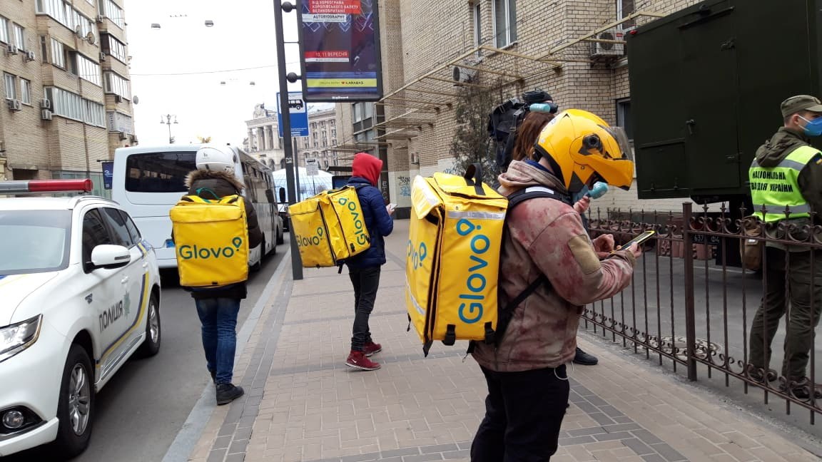 Возле гостиницы собираются курьеры Glovo, которые доставляют эвакуированным еду. Люди жалуются, что уже более суток ничего не ели.