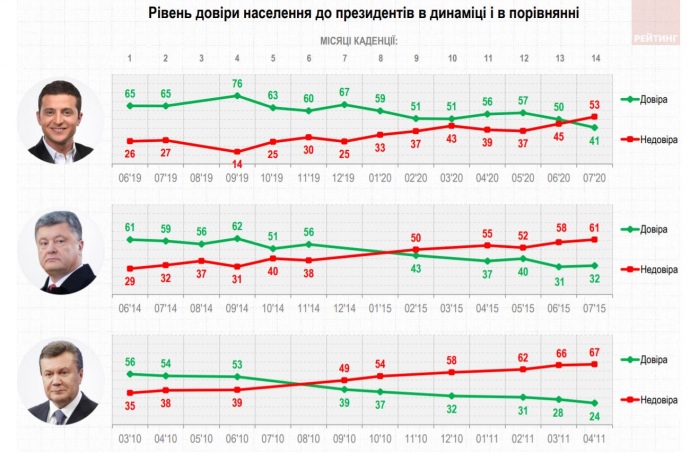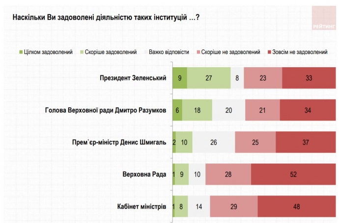Деятельностью Зеленского довольны 36%, а 56% — не удовлетворены, работой Разумкова довольны 24%, и 55% — не удовлетворены. Работу Шмыгаля одобряют лишь 12%, четверть не могут оценить его деятельность, и 62% — не одобряют.