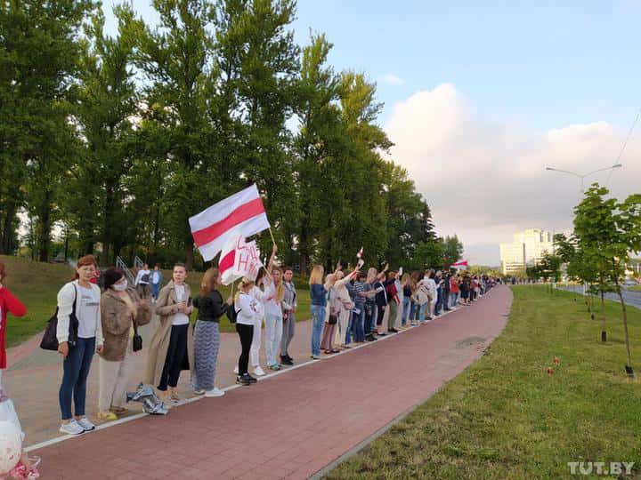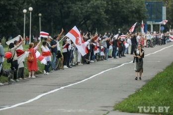 В Минске люди образовали живую цепь длиной около 13 километров, чтобы выразить протест против применения силы к мирным демонстрантам и солидарность с пострадавшими.