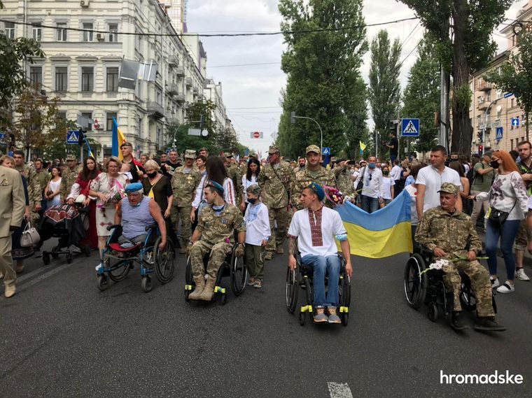 В Киеве состоялся Марш защитников, организованный волонтерами. В нем приняли участие бойцы Вооруженных сил, добровольческих батальонов, организации ветеранов боевых действий и семей погибших бойцов. Они прошли по центру столицы, от парка имени Тараса Шевченко до Европейской площади.