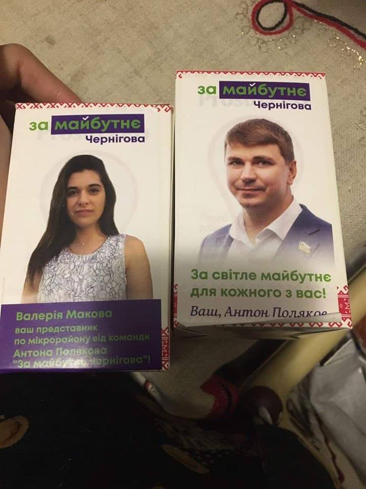На лампочках размещен логотип политической партии «За майбутнє», указано имя и фото кандидата Валерии Маковой и надпись: «Ваш представитель по микрорайону от команды Антона Полякова «За майбутнє» Чернигова!».
