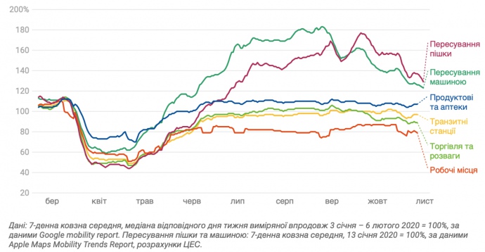Население Украины за последнюю неделю сократило передвижения автомобилями или пешком на 4%. За последний месяц падение составило 14%.