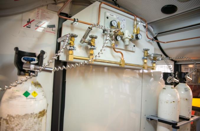 Были удалены два ряда сидений, а на их месте установили стальные конструкции для транспортировки кислородных баллонов. Также демонтировали валидаторы и билетный автомат.