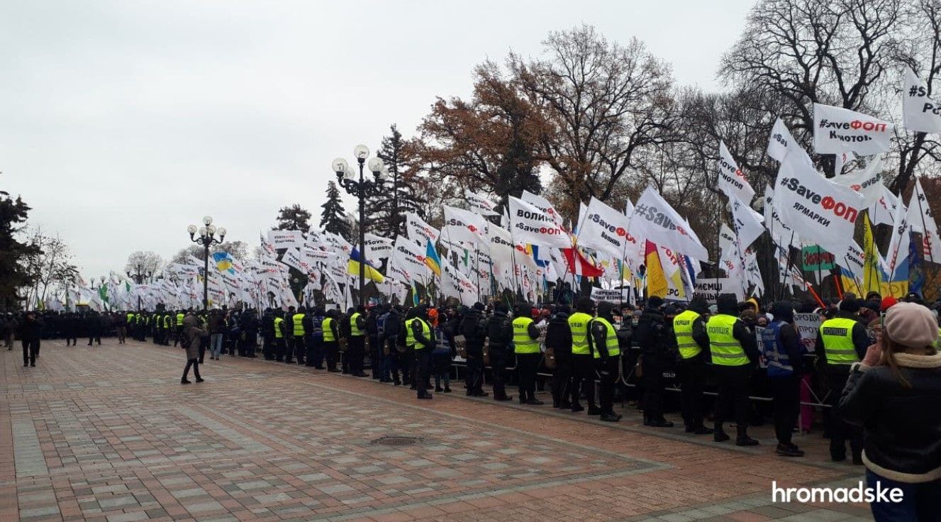 Люди держат флаги Украины и белые флаги с надписями «SaveФОП» и названиями городов. Предприниматели требуют принятия законопроектов №2644 и №2645, которые предлагают отменить законы 128-IX и 129-IX. Последние обязывают предпринимателей иметь кассовые аппараты.