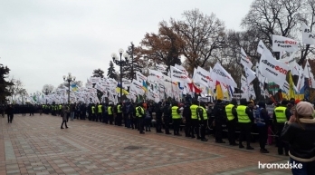 Митингующие перекрыли дорогу в Верховную Раду, авто проехать не могут. В то же время отдельные народные депутаты беспрепятственно проходят в парламент через толпу.