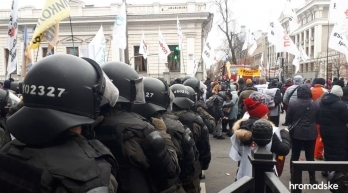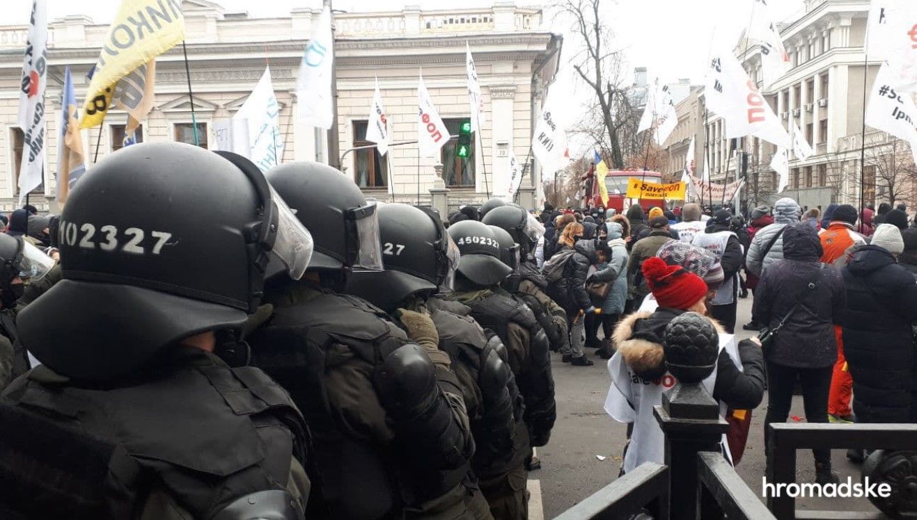 В Киеве митингующие, которые выступают против введения кассовых аппаратов для физических лиц-предпринимателей, перекрыли движение по улице Грушевского в правительственном квартале.