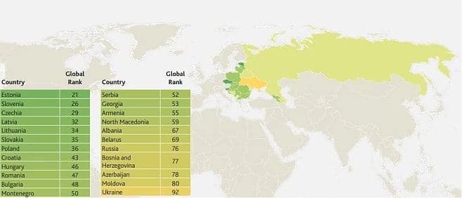 В общем рейтинге Украина разместилась между Кыргызстаном и Гайаной (Южная Америка), которые на 90 и 91 местах соответственно, и Сальвадором и Турцией (93 и 94 места соответственно). Россия в рейтинге на 76 месте.