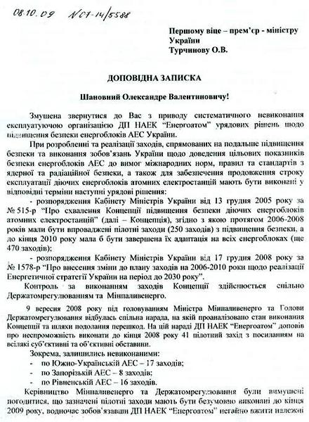 Издание «Левый берег» опубликовало докладную записку председателя Госкомитета по ядерному регулированию Елены Миколайчук, адресованную первому вице-премьр-министру Украины Александру Турчинову.