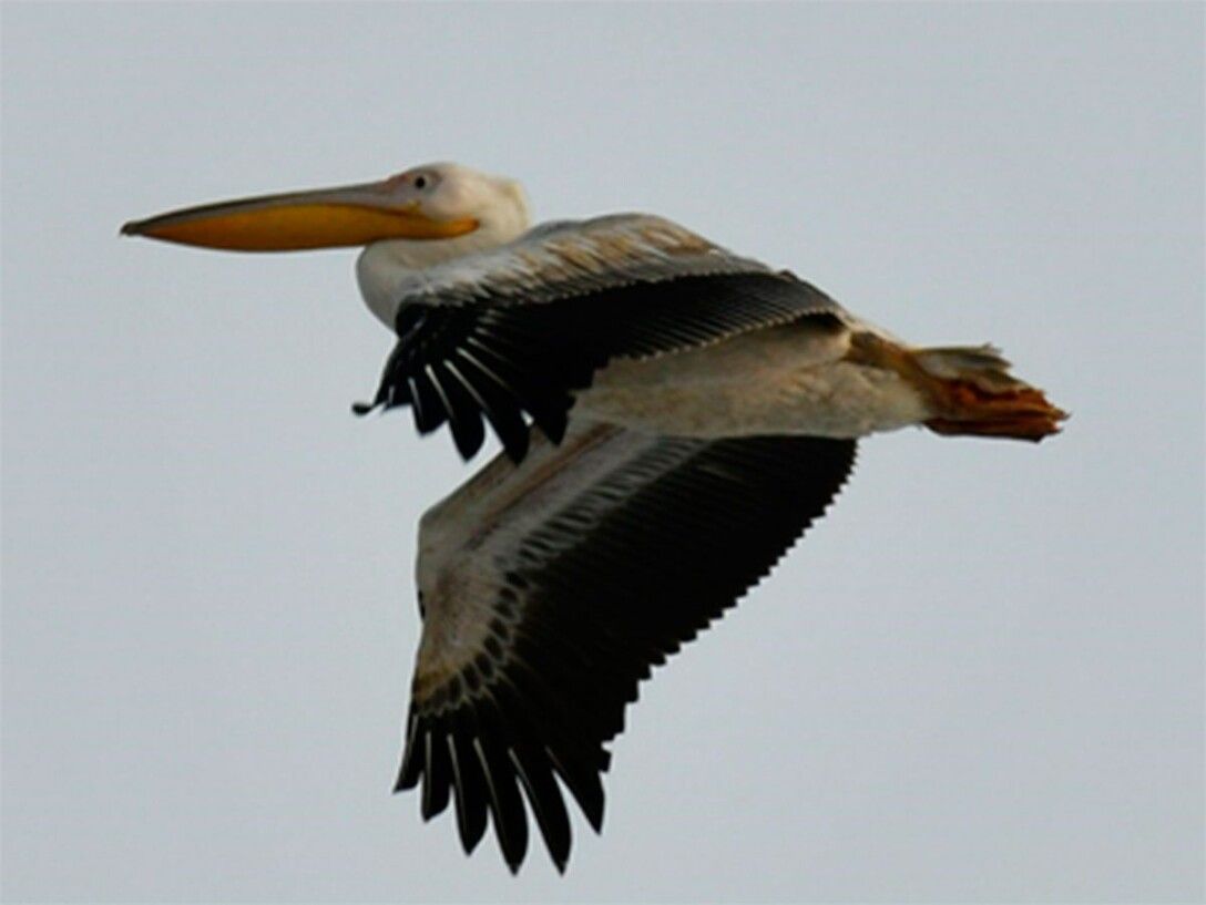 Пеликана сфотографировали в полете, он не был ранен охотниками и у него было достаточно еды, чтобы подняться в воздух.