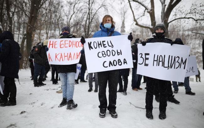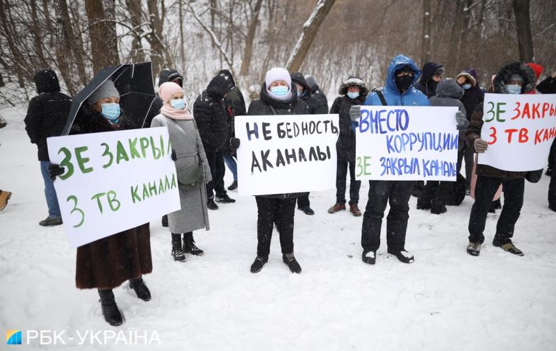Участники митинга выступают против закрытия телеканалов Newsone, ZIK и «112 Украина».