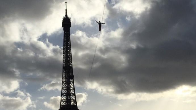 Трюкач Натан Полин устроил представление для парижан и гостей города — в субботу он в течении 30 минут шел по длинному канату на 70-метровой высоте.
