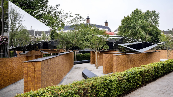 Памятник, спроектированный 75-летним Даниэлем Либескиндом, потерявшим родственников во время Холокоста, находится в центре нидерландской столицы и представляет собой лабиринт кирпичных стен, которые, если смотреть сверху, образуют еврейские буквы, читаемые «в память».