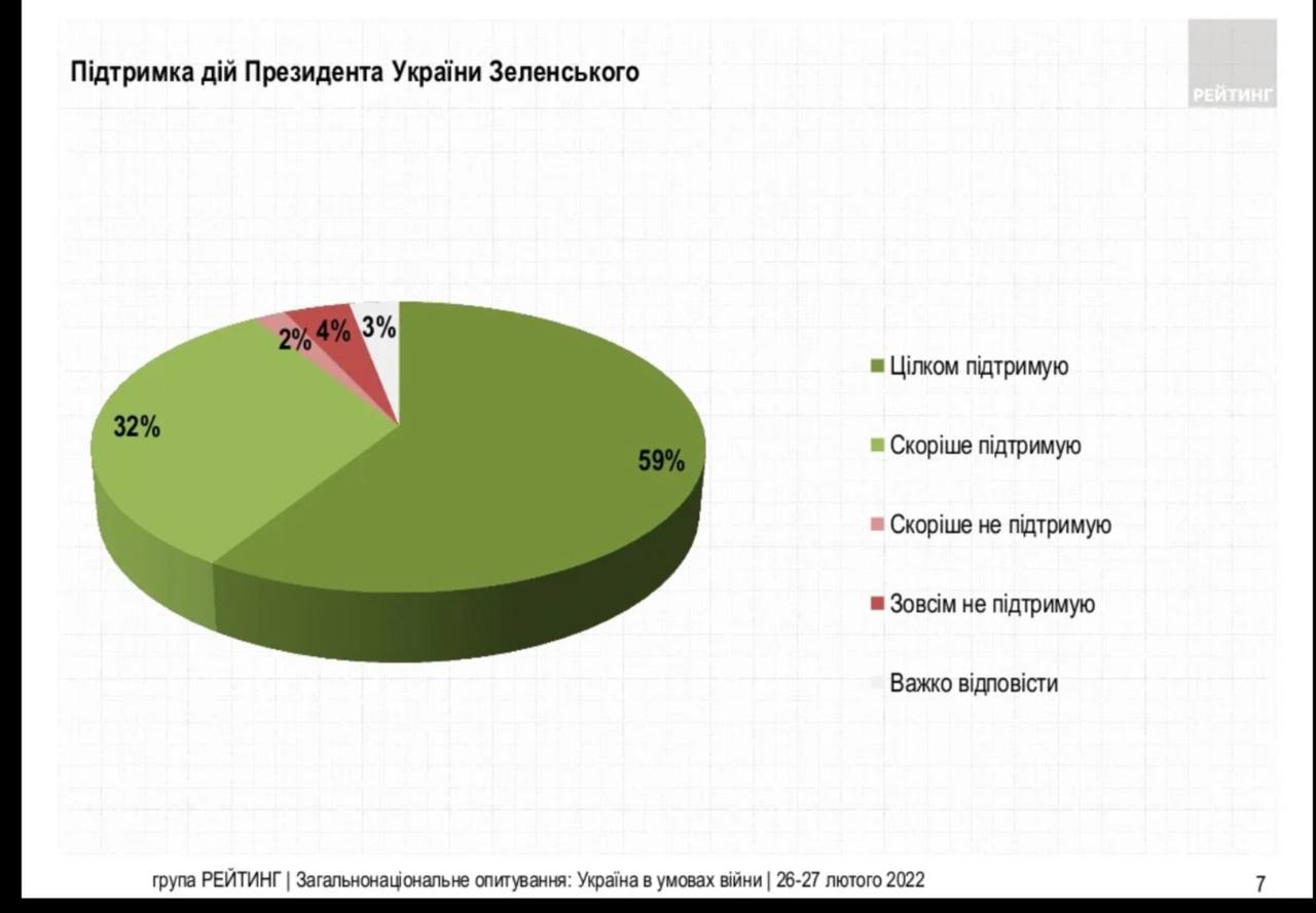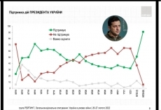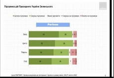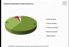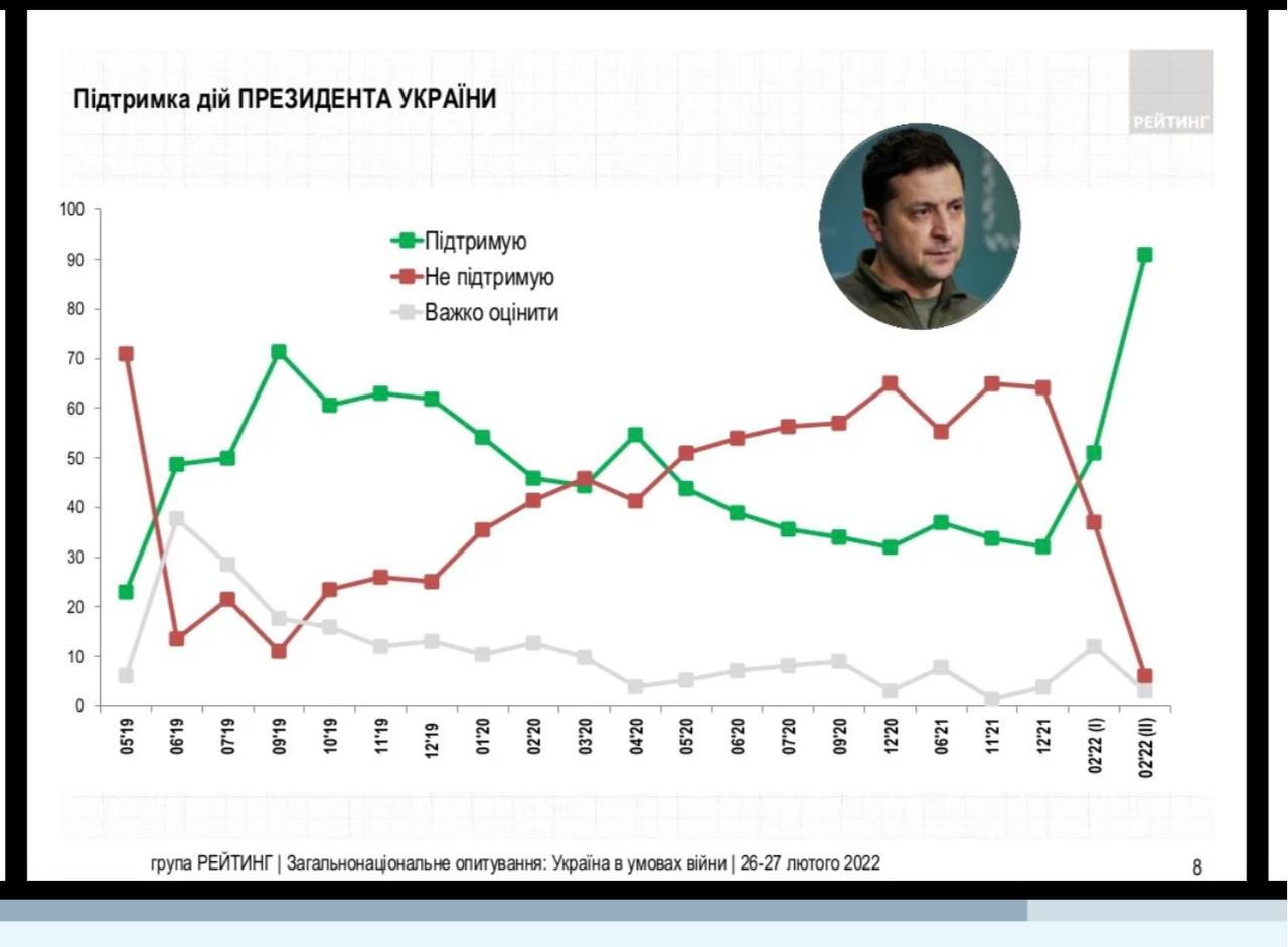 При этом 91% украинцев поддерживают действия Президента Зеленского. Не поддерживают — 6%, затруднились ответить — 3%. Примечательно, что с декабря 2021 года поддержка действий президента Украина выросла втрое.