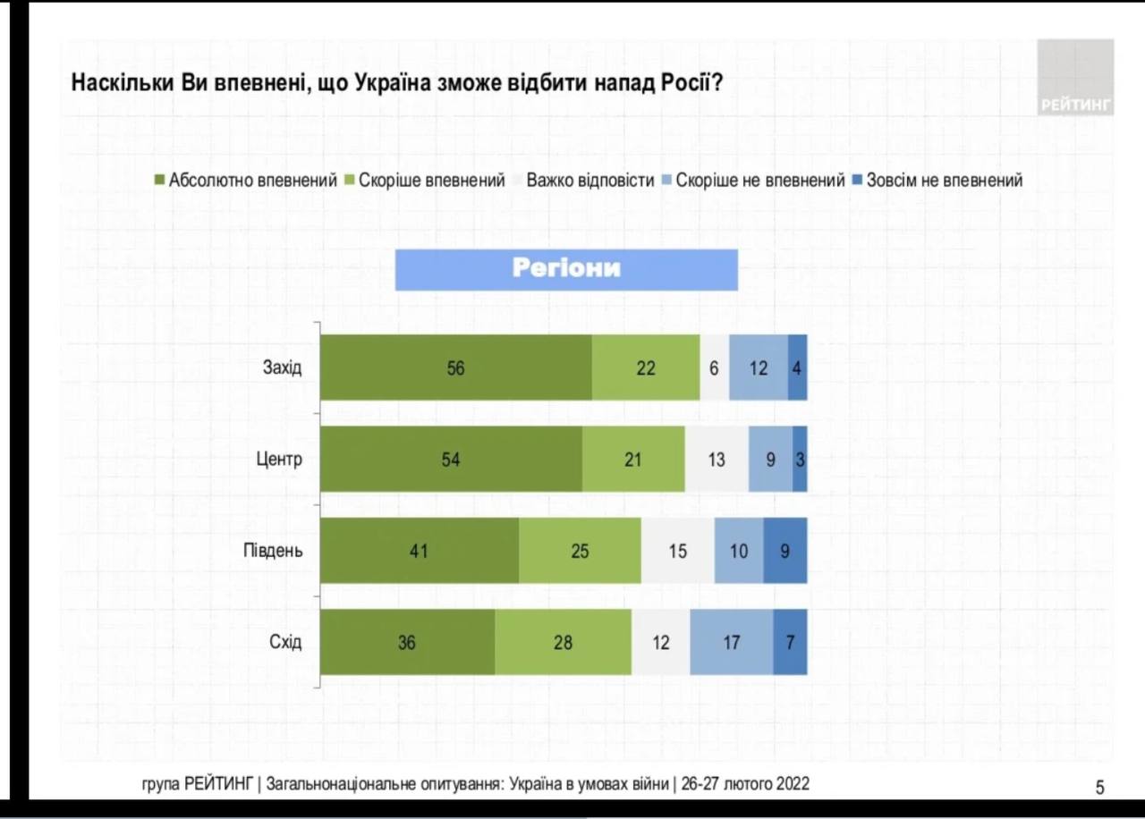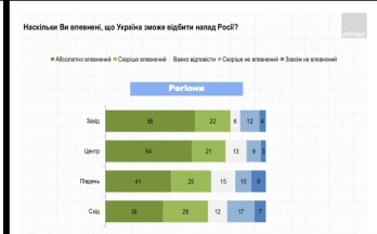 Уровень веры в собственные вооруженные силы за последнюю неделю существенно вырос. Ни в одном регионе не наблюдается преобладания пессимистических настроений. Самый высокий уровень уверенности в Вооруженных Силах — на западе и в центре (75-78%). Относительно ниже — на юге и на востоке (64-66%).