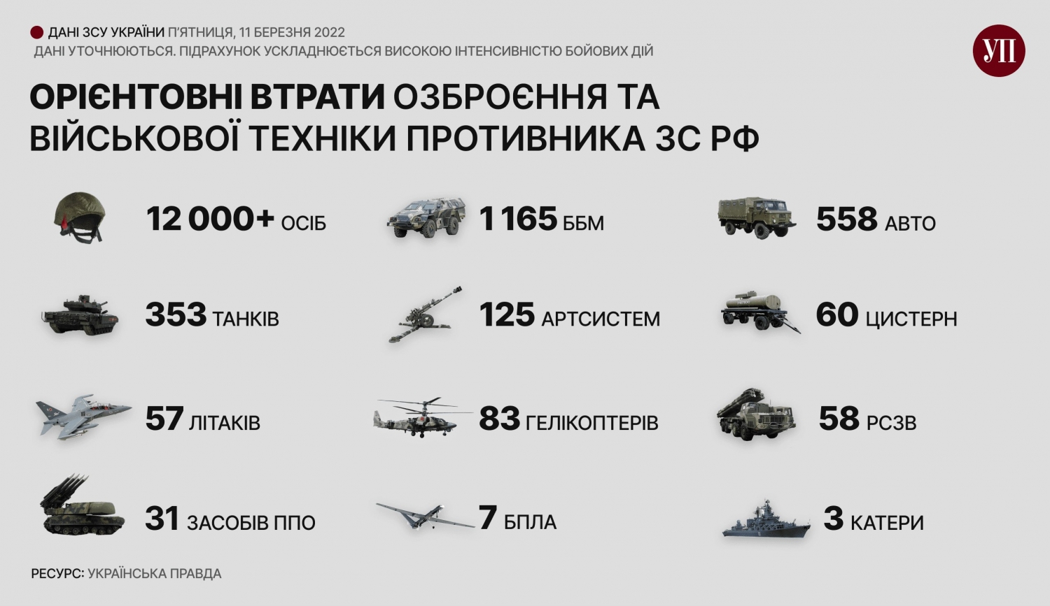 В Генштабе сообщили о потерях российских оккупантов с 24 февраля по 6 марта: более 11 000 человек, 285 танков, 985 боевых бронированных машин, 109 артиллерийских систем, 21 средство ПВО, 44 самолета, 48 вертолетов и т. д. Данные уточняются.