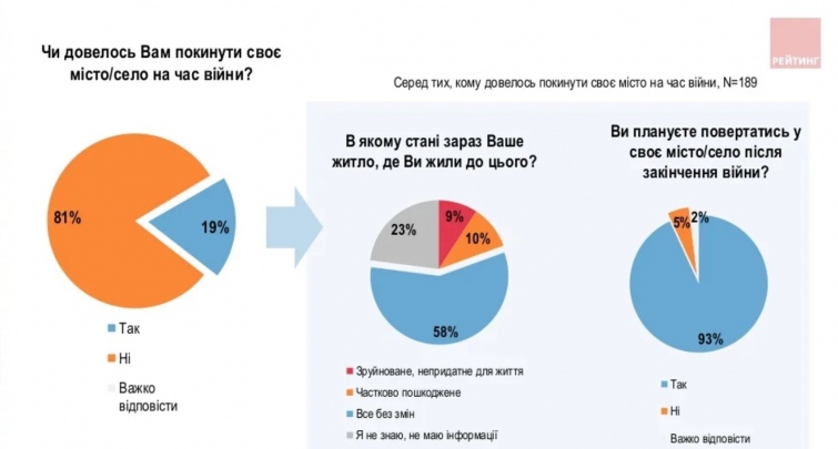 Кроме разрыва с семьей, 19% украинцев были вынуждены покинуть свое место жительства. Больше всего таких людей среди жителей востока Украины. При этом 93% из них планируют обязательно вернуться домой после окончания войны.