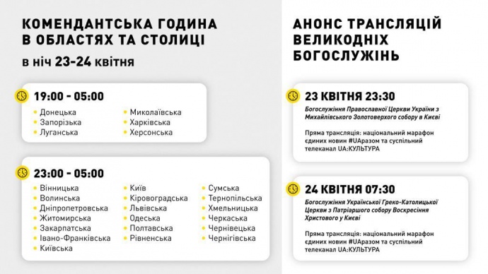«Сегодня, 23 апреля, с 19 вечера до 5 утра 24 апреля Донецкая, Запорожская, Луганская, Николаевская, Харьковская, Херсонская области будут закрыты для передвижения граждан. В центральной части и в западных областях комендантский час начнется чуть позже — с 23:00 и тоже продлится 5 утра», — отметил он.