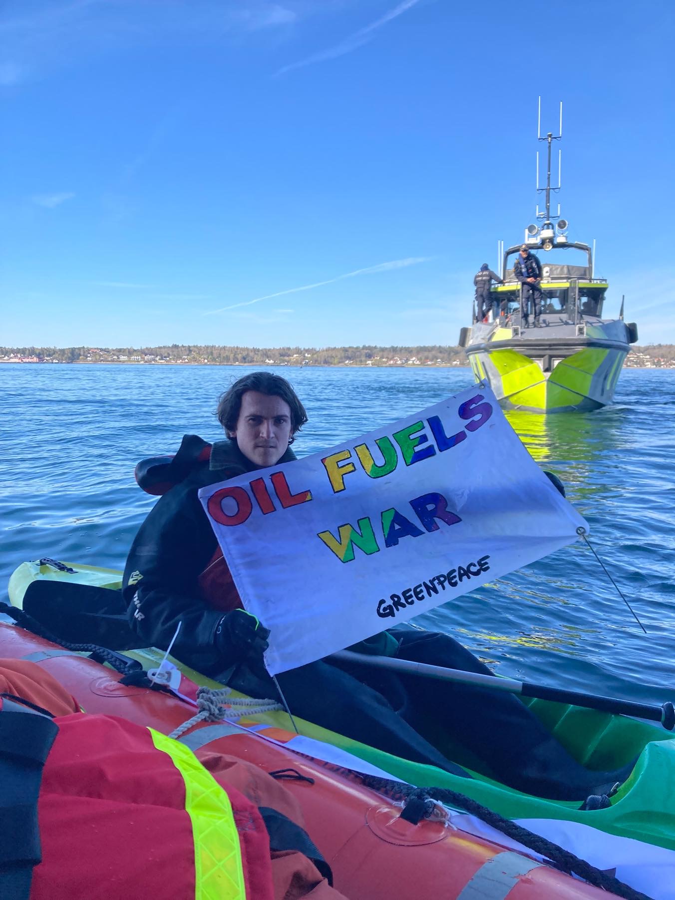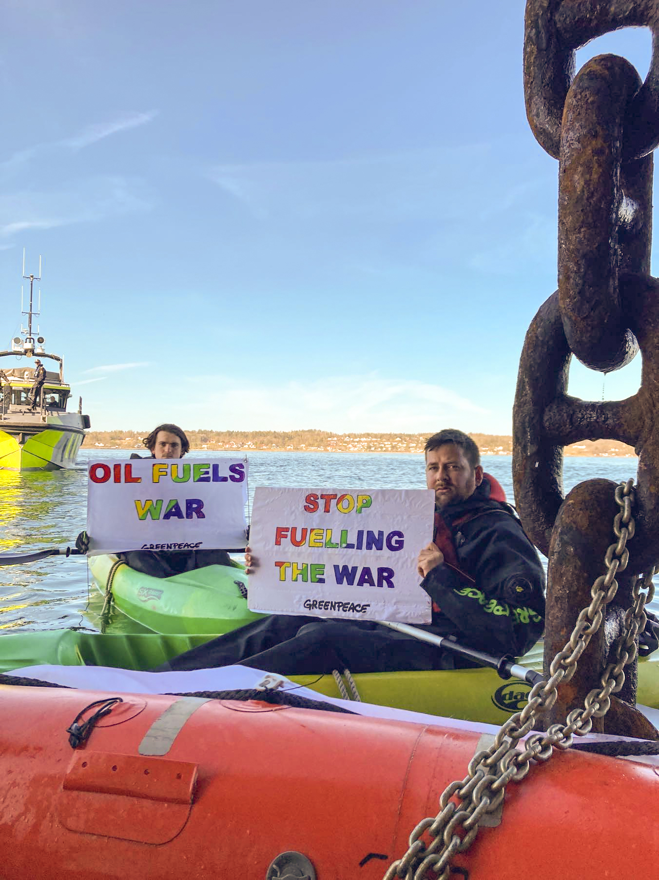 Экоактивисты приковали свою надувную лодку к якорной цепи танкера, чтобы не дать ему зайти в порт. Другие активисты, приплывшие к судну на байдарках, держат плакаты с надписью: «Нефть разжигает войну».