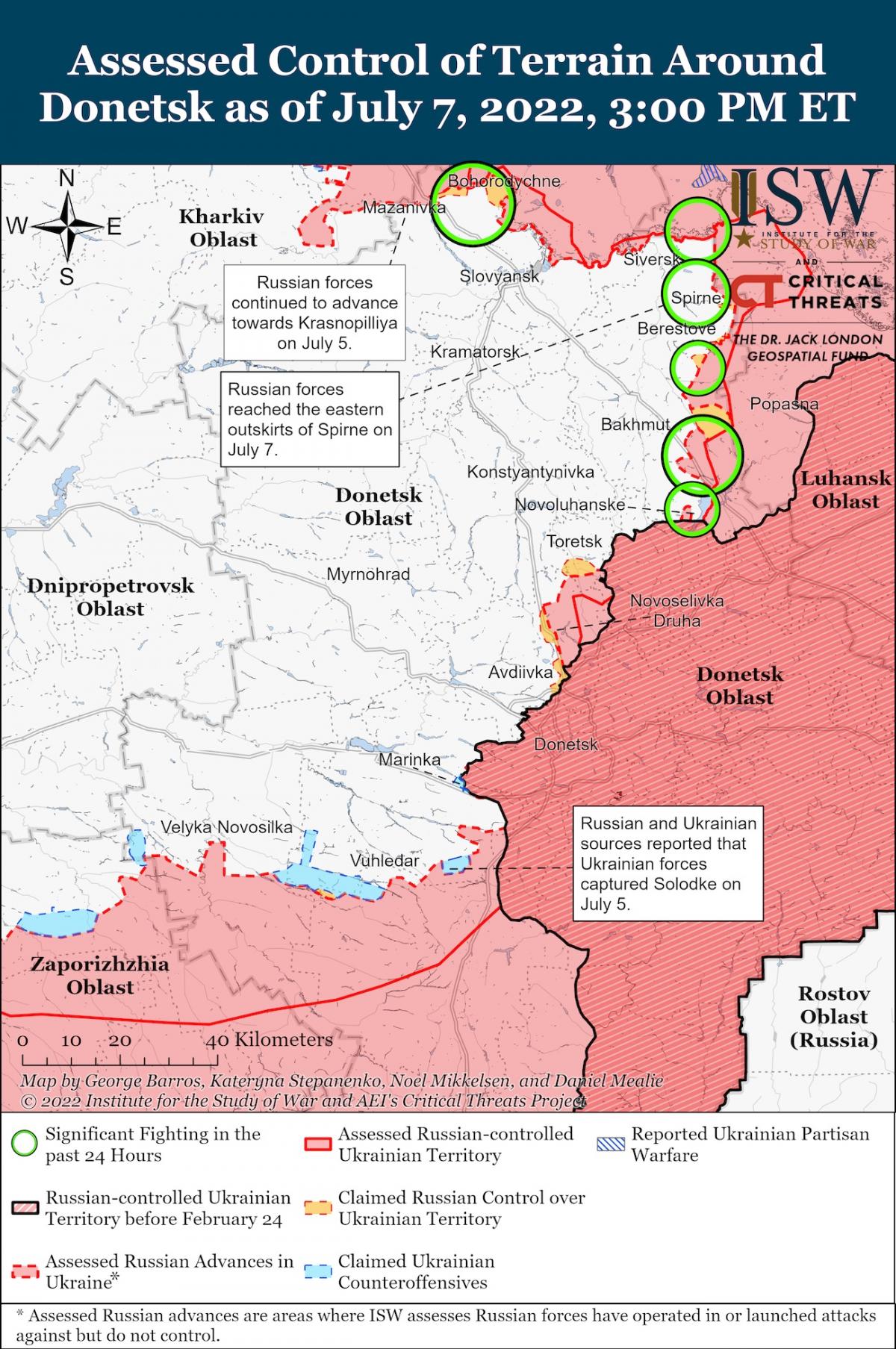 Отмечается, что российские войска добились незначительных успехов на юго-восток от Северска и продолжили наступательные действия на запад от Лисичанска. Оккупанты нанесли артиллерийские удары к югу от Барвенкова и обстреляли Никополь, Новопавловку и несколько населенных пунктов на северо-запад от Славянска. По мнению аналитиков ISW, эти удары могут свидетельствовать о том, что оккупанты стремятся обойти Барвенково с востока и либо двигаться в направлении шоссе E40 Изюм-Славянск для продвижения на юго-восток в сторону Славянска, либо двигаться прямо на юго-восток от Барвенкова в сторону Краматорска.
