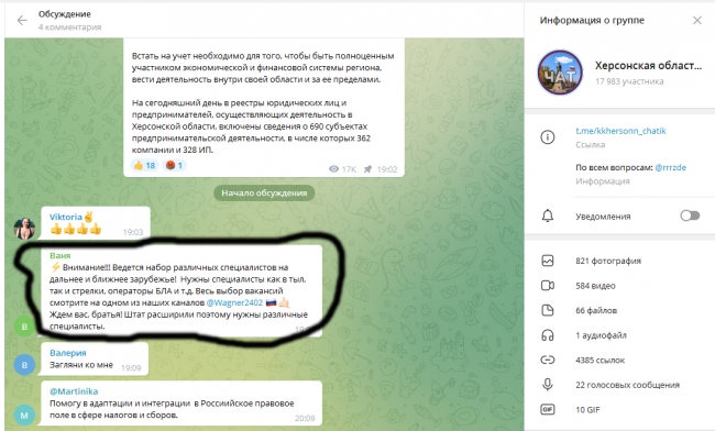 В качестве примера типичного объявления «вагнеровцев» журналисты приводят пост под телеграм-каналом «Главное в Херсоне».