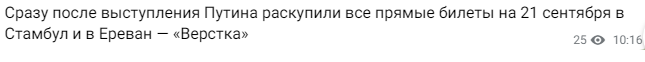 Отмечается, что в воронежском канале появилось сообщение о том, что после выступления Владимира Путина люди раскупили все прямые билеты на 21 сентября в Стамбул и в Ереван – «Верстка».