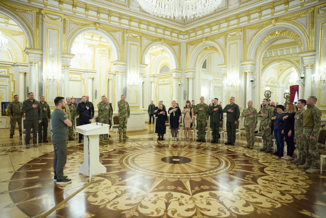 Президент Украины Владимир Зеленский вручил ордена «Золотая Звезда» военнослужащим, которым присвоено звание Героя Украины, и членам семей погибших защитников, удостоенных этого звания посмертно.