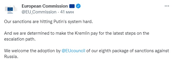 —Европейская Комиссия приветствует сегодняшнюю договоренность государств-членов ЕС о 8-м пакете санкций. Мы никогда не согласимся с фальшивыми путинскими референдумами и какой-либо аннексией в Украине. Мы решительно настроены продолжать заставлять Кремль платить, — говорится в сообщении.