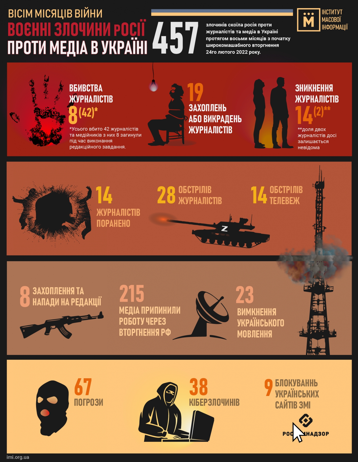 За восемь месяцев полномасштабной войны Россия совершила 457 преступлений против журналистов и медиа в Украине. Таковы данные мониторинга Института массовой информации.