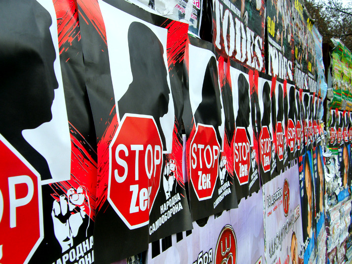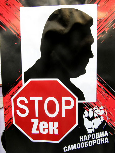 На одной из них за знаком «STOP Zek» явно угадывается силуэт главного «регионала». Логотип «Народной самообороны» свидетельствовует о том, что акция эта была тщательно подготовлена.