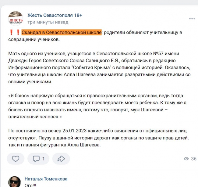 Федеральная служба безопасности РФ начала преследование супруги коллаборанта Аллы Шагеевой. Женщину, работающую учителем в одной из школ временно оккупированного Севастополя, подозревают в растлении несовершеннолетних.