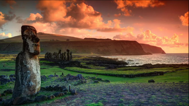 На острове Пасхи расположены около тысячи всемирно известных гигантских каменных статуй и резных фигурок, самая большая из которых весит 74 тонны и достигает 10 метров в высоту. Фигуры вырезали коренные жители Рапа-Нуи где-то между 1400 и 1650 годами. Они расположены так, чтобы образовать кольцо вокруг острова.
