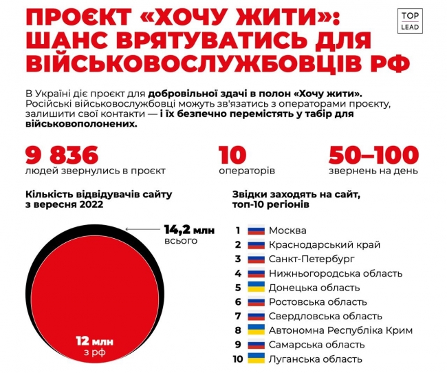 В единый центр приема обращений военнослужащих РФ по сдаче в плен «Хочу жить» обратились уже 9836 человек из России и временно оккупированных территорий Украины.