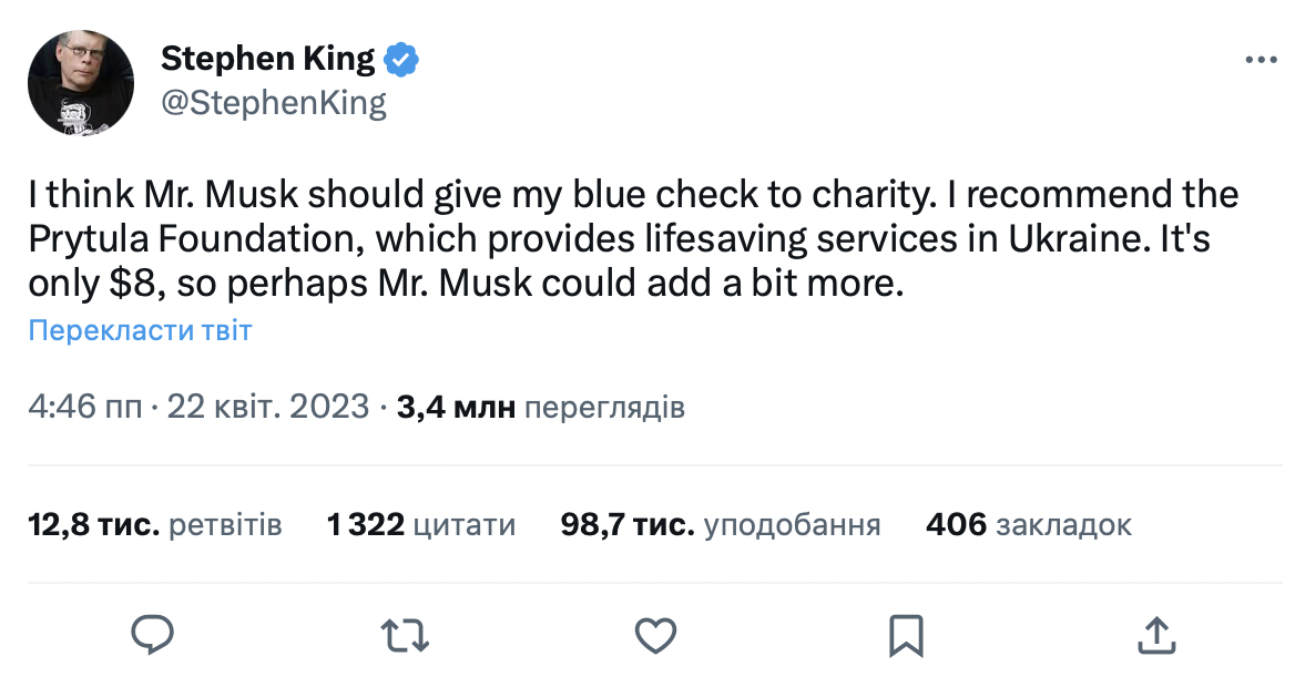 — Я думаю, что мистеру Маску стоит отдать мою синюю галочку на благотворительность. Я рекомендую Фонд Приюты, предоставляющий услуги по спасению жизни в Украине, – написал Стивен Кинг.