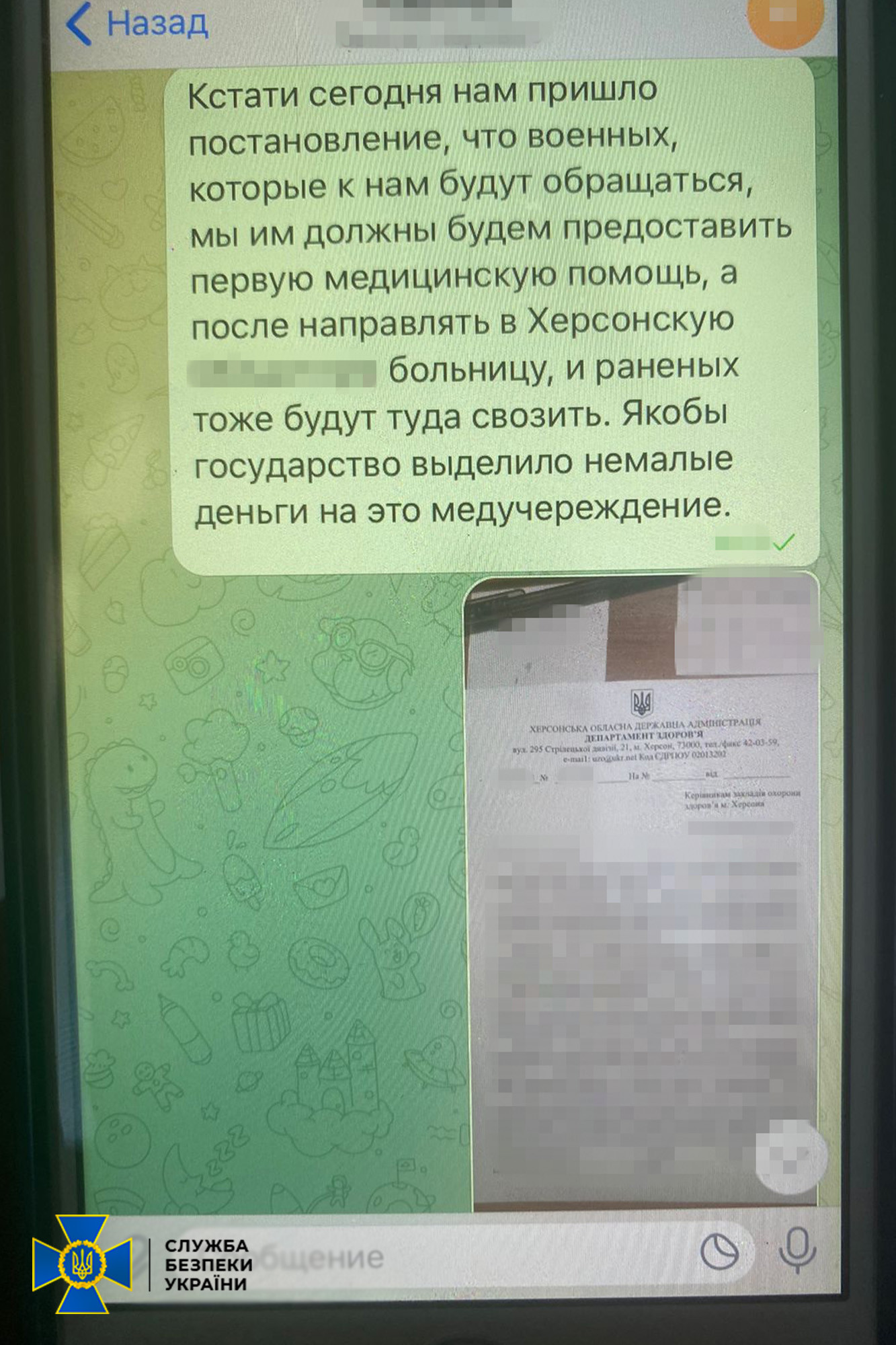 После увольнения Херсона женщина продолжила поддерживать контакт с представителями государства-агрессора. Через мессенджер она передавала своему знакомому – представителю российской спецслужбы данные украинских защитников, проходивших лечение в медицинском учреждении.